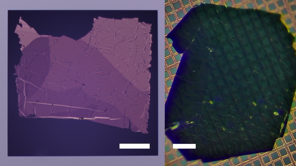 Ultrathin (< 100 nm) single-crystalline flakes studied by ultrafast electron diffraction and attosecond transient absorption spectroscopy, both in transmission geometry. Left: LaTe3 mounted on a 10-nm-thick silicon nitride window (scale bar, 50 µm). Right: TiSe2 mounted on 600 lines/inch copper grids (scale bar, 100 µm).