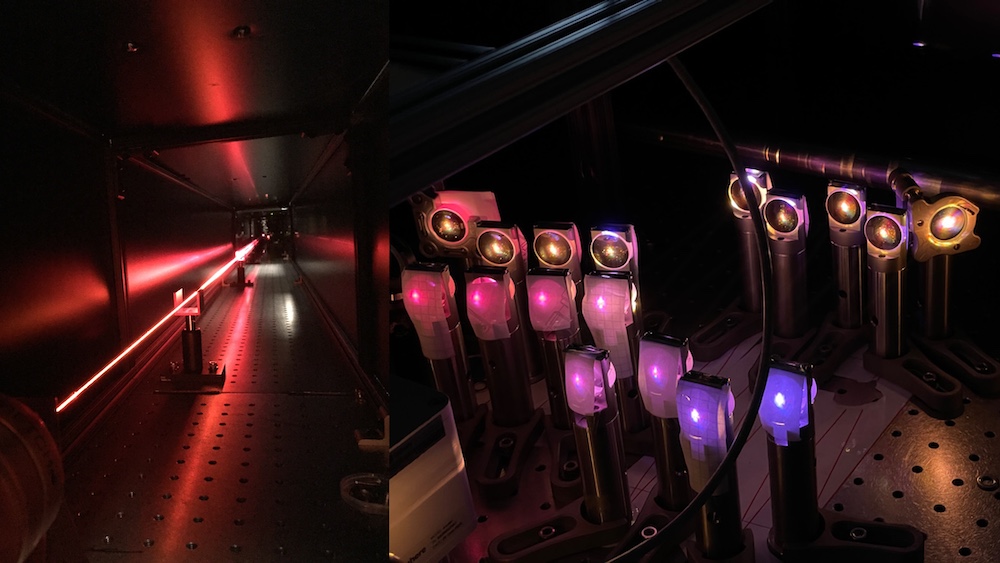 To obtain high-energy, few-cycle visible/near-infrared pulses, the output of a commercial amplified laser system is first sent through a six-meter-long hollow-core fiber filled with noble gas (e.g., neon) for spectral broadening (left) and then temporally compressed by an array of chirped mirrors (right).